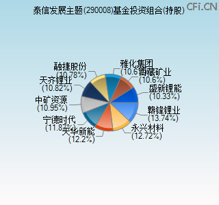 | | | 泰信发展主题(290008)基金投资组合(持股)>>详细 | | 截止日期 | 股票代码 | 股票名称 | 股票名称 | 数量(万股) | 持有市值(万元) | 占净值比 | | 2025-09-30 | 002460 | 赣锋锂业 | 2025-09-30 赣锋锂业 | 8.33 | 506.83 | 13.74% | | 2025-09-30 | 002756 | 永兴材料 | 2025-09-30 永兴材料 | 12.11 | 469.32 | 12.72% | | 2025-09-30 | 300390 | 天华新能 | 2025-09-30 天华新能 | 18.01 | 450.16 | 12.20% | | 2025-09-30 | 300750 | 宁德时代 | 2025-09-30 宁德时代 | 1.09 | 438.18 | 11.87% | | 2025-09-30 | 002738 | 中矿资源 | 2025-09-30 中矿资源 | 8.16 | 403.96 | 10.95% | | 2025-09-30 | 002466 | 天齐锂业 | 2025-09-30 天齐锂业 | 8.39 | 399.27 | 10.82% | | 2025-09-30 | 002192 | 融捷股份 | 2025-09-30 融捷股份 | 10.12 | 397.93 | 10.78% | | 2025-09-30 | 002497 | 雅化集团 | 2025-09-30 雅化集团 | 26.30 | 391.12 | 10.60% | | 2025-09-30 | 000762 | 西藏矿业 | 2025-09-30 西藏矿业 | 16.01 | 391.11 | 10.60% | | 2025-09-30 | 002240 | 盛新锂能 | 2025-09-30 盛新锂能 | 20.07 | 381.14 | 10.33% |