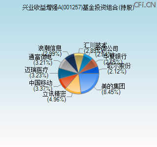 | | | 兴业收益增强A(001257)基金投资组合(持股)>>详细 | | 截止日期 | 股票代码 | 股票名称 | 股票名称 | 数量(万股) | 持有市值(万元) | 占净值比 | | 2025-09-30 | 000333 | 美的集团 | 2025-09-30 美的集团 | 730.00 | 53041.79 | 8.45% | | 2025-09-30 | 002475 | 立讯精密 | 2025-09-30 立讯精密 | 480.93 | 31111.36 | 4.96% | | 2025-09-30 | 600941 | 中国移动 | 2025-09-30 中国移动 | 202.36 | 21183.15 | 3.37% | | 2025-09-30 | 300760 | 迈瑞医疗 | 2025-09-30 迈瑞医疗 | 82.43 | 20252.23 | 3.23% | | 2025-09-30 | 002156 | 通富微电 | 2025-09-30 通富微电 | 501.67 | 20152.08 | 3.21% | | 2025-09-30 | 000977 | 浪潮信息 | 2025-09-30 浪潮信息 | 252.10 | 18761.15 | 2.99% | | 2025-09-30 | 300124 | 汇川技术 | 2025-09-30 汇川技术 | 216.41 | 18139.49 | 2.89% | | 2025-09-30 | 688012 | 中微公司 | 2025-09-30 中微公司 | 59.71 | 17851.32 | 2.84% | | 2025-09-30 | 600015 | 华夏银行 | 2025-09-30 华夏银行 | 2523.29 | 16603.25 | 2.65% | | 2025-09-30 | 002241 | 歌尔股份 | 2025-09-30 歌尔股份 | 354.09 | 13278.38 | 2.12% |